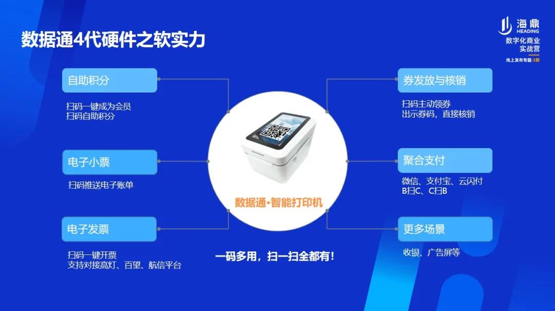 在軟件實(shí)力方面,數(shù)據(jù)通4.0產(chǎn)品集成了支付功能、電子小票、會員招募、電子發(fā)票、券發(fā)放與核銷等多項(xiàng)功能,支持在移動端或設(shè)備上直接配置。
