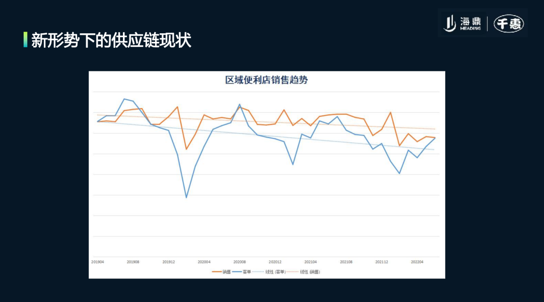 第二張圖是某個區域便利店的銷售數據,可以看到從2020年至今,銷售額谷底出現在2020年疫情剛爆發的時候,而且銷售趨勢線和客流趨勢線相隔越來越遠,這意味雖然單價好像提高了,但是客流卻減少了,整體呈現下行趨勢。